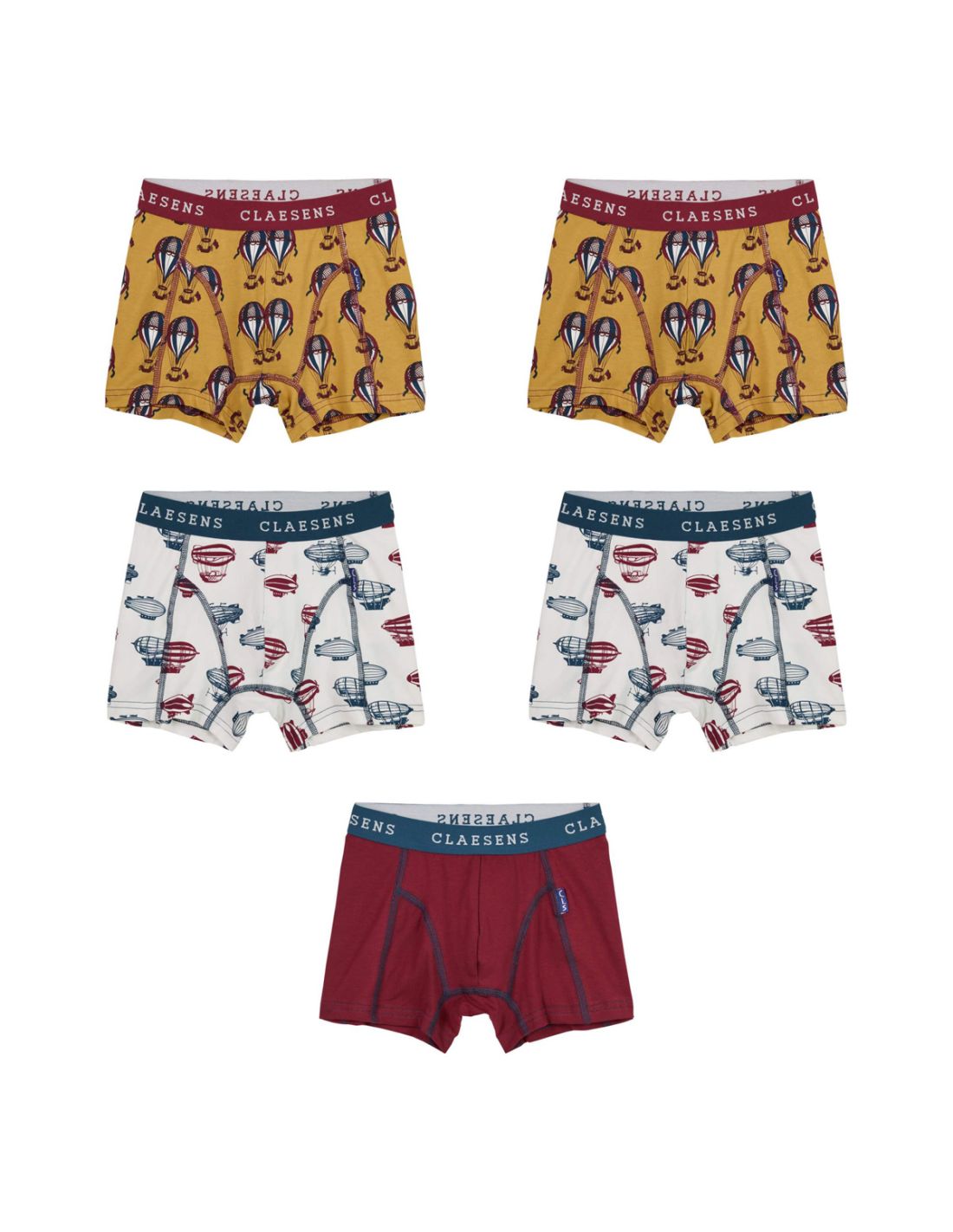 De Claesens Jongens Boxer 5pack Multi Balloon is een kleurrijke en comfortabele set boxershorts die elke dag nét wat leuker maakt. De set bestaat uit twee okergele boxers met een vrolijke luchtballonnenprint, twee off-white varianten met een stoere zeppelinprint in navy en bordeaux, en één effen bordeauxrode boxer.