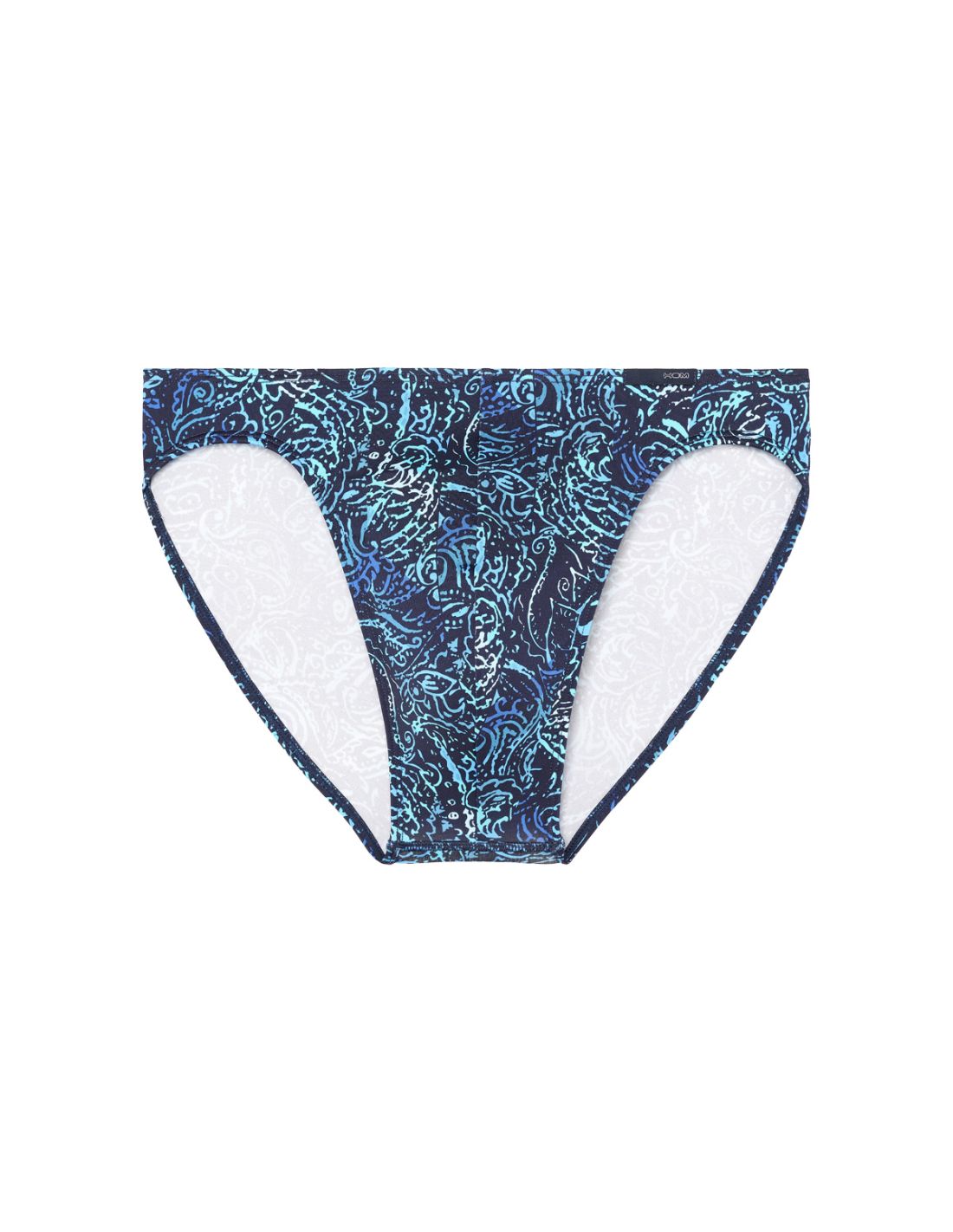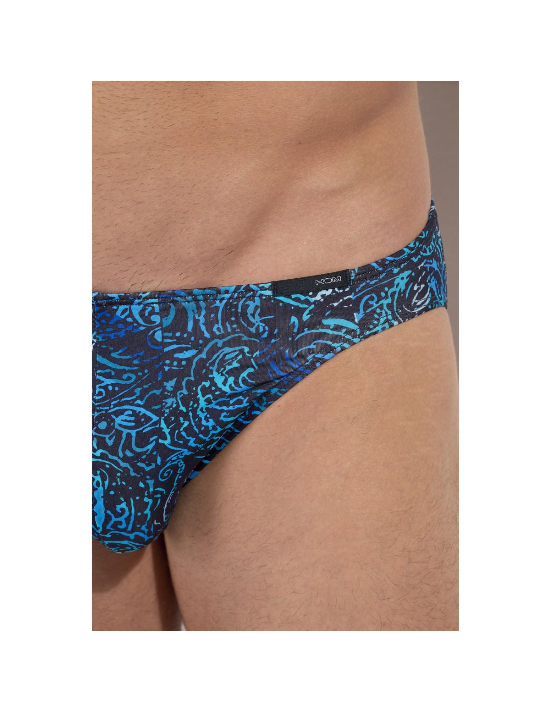 De HOM Funky Styles Micro Brief combineert lichtgewicht, ademende microvezel met een gemoderniseerde paisleyprint in blauwtinten op navy voor een sterke, grafische look. De hoge beenuitsnede bevrijdt de heupen en geeft grote bewegingsvrijheid, terwijl de laag uitgesneden, met stof beklede tailleband schuren en drukpunten voorkomt — ideaal voor dagelijks draagcomfort.