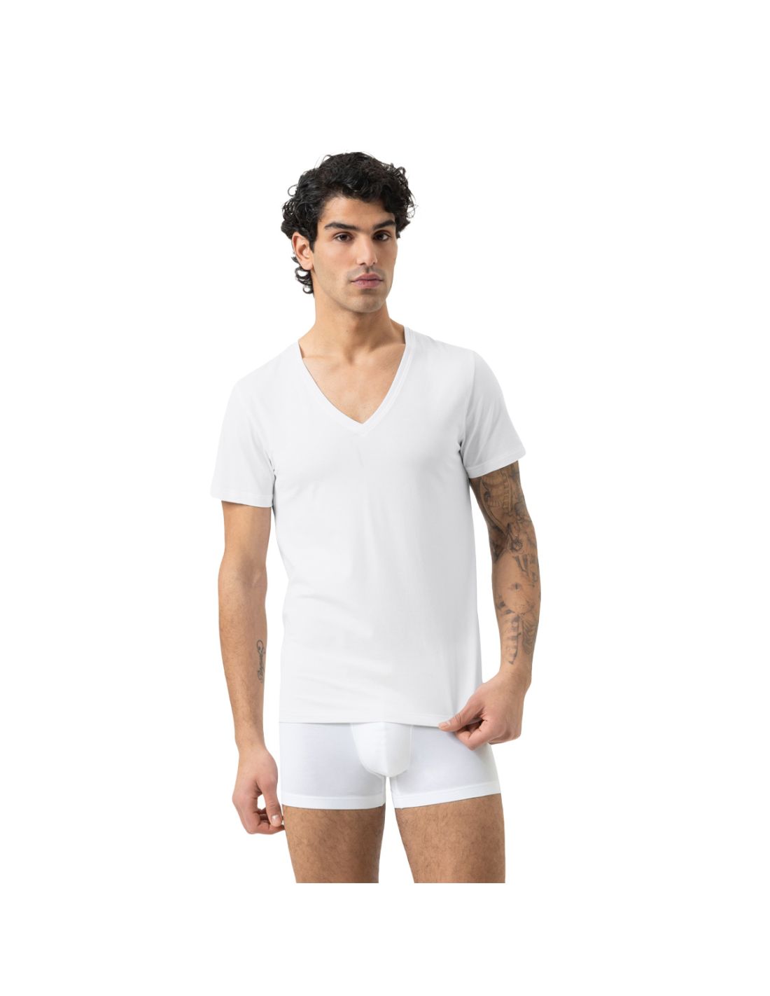 Het MEY 10 out of 10 V-hals T-shirt in wit combineert premium gemerceriseerd katoen met een elegante, elastische single jersey voor uitzonderlijk draagcomfort. De nauwsluitende pasvorm en V-hals zorgen voor een strak, puristisch silhouet dat zowel onder een overhemd als solo uitstekend tot zijn recht komt. Dankzij het vleugje elastaan blijft het shirt vormvast en soepel meerekken, was na was.
