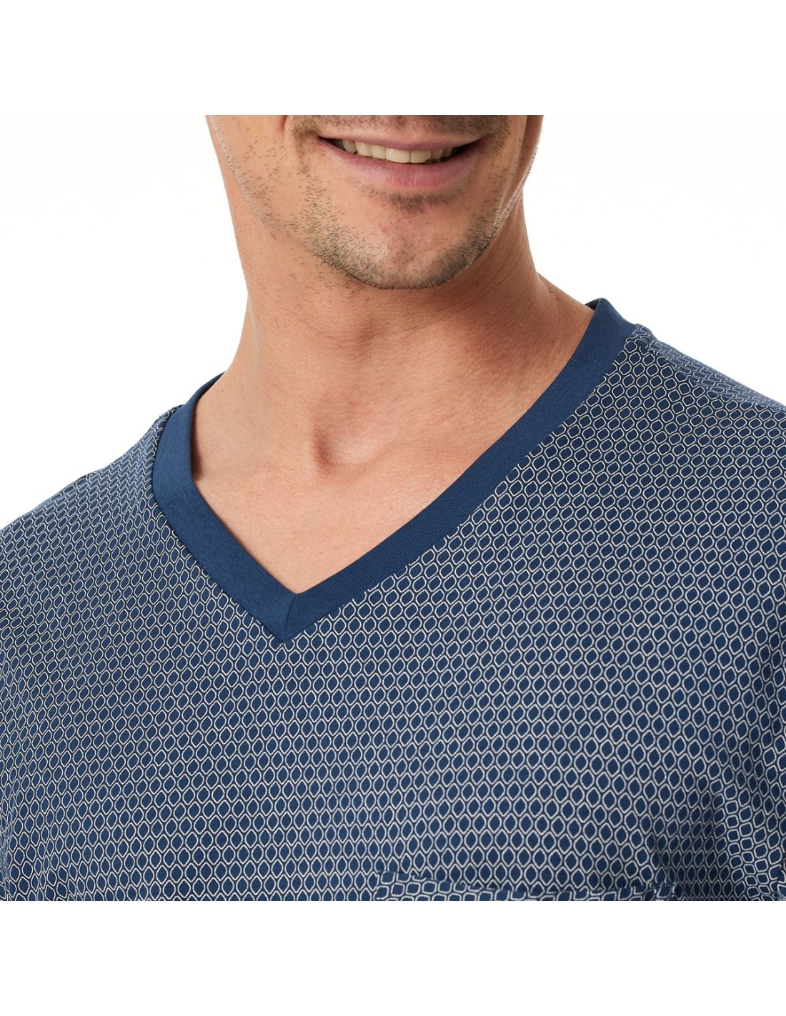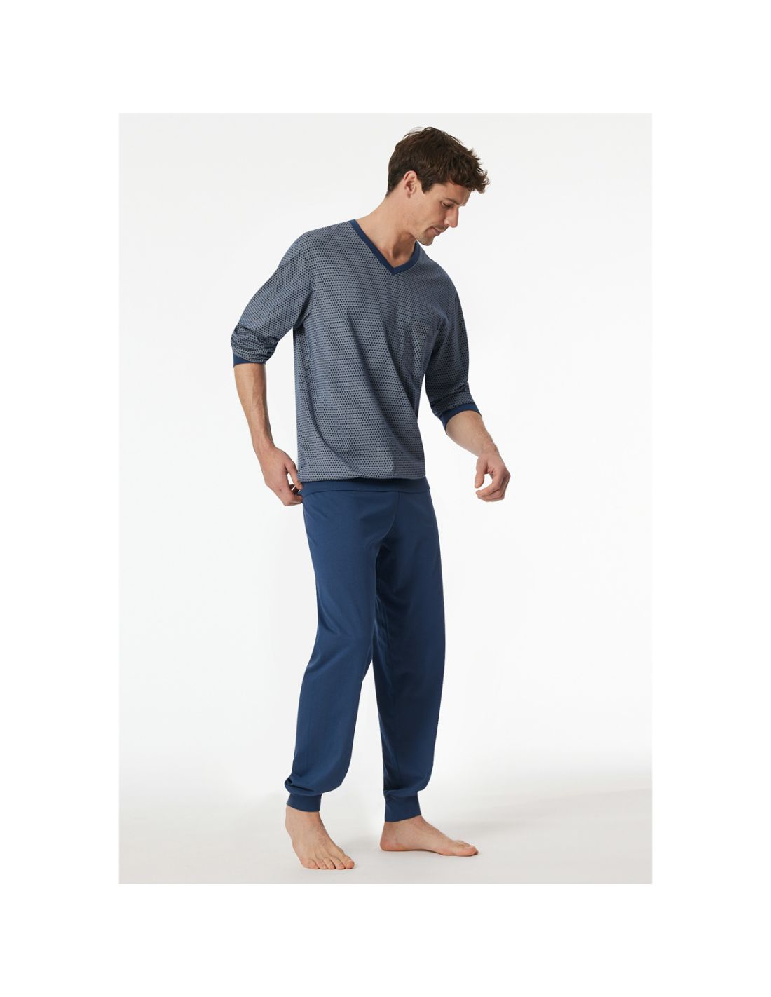 Ontdek de perfecte balans tussen comfort en casual stijl met deze lange herenpyjama uit de Comfort Essentials collectie van SCHIESSER. Het bovenstuk is voorzien van een stijlvol patroon, een klassieke V-hals en een praktisch opgezet borstzakje, terwijl de effen broek de pyjama een tijdloze uitstraling geeft. Dankzij de soepelvallende Single Jersey stof voelt de pyjama zacht aan op de huid en biedt hij maximale bewegingsvrijheid. Extra comfortabele manchetten aan de armen, benen en taille zorgen voor een ideale pasvorm, zodat u zich de hele nacht door ontspannen voelt. Deze pyjama is de ideale keuze voor mannen die ongecompliceerd comfort en kwaliteit waarderen.