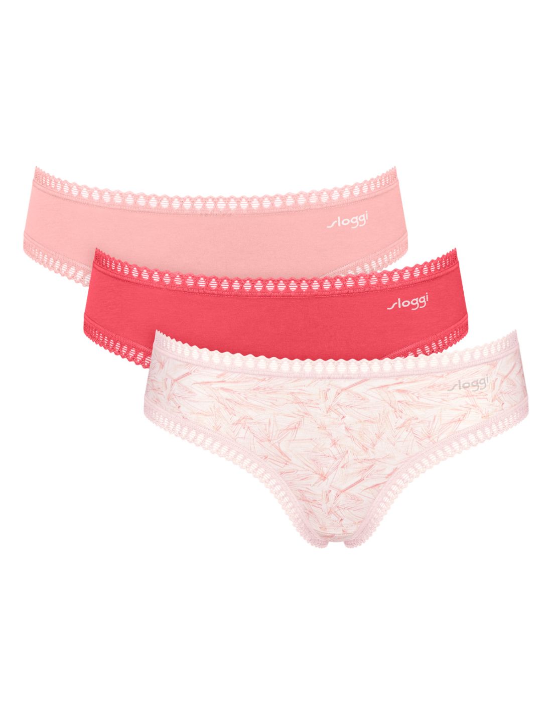 Mooi 3pack hipster slips uit de GO Crush collectie in diverse kleuren roze. De GO Crush collectie van Sloggi is de essential in je kledingkast. Deze moderne variant van de multipacks is gemaakt van GOTS katoen en heeft een kanten randje, met een slip met een mooie print in elke verpakking.
